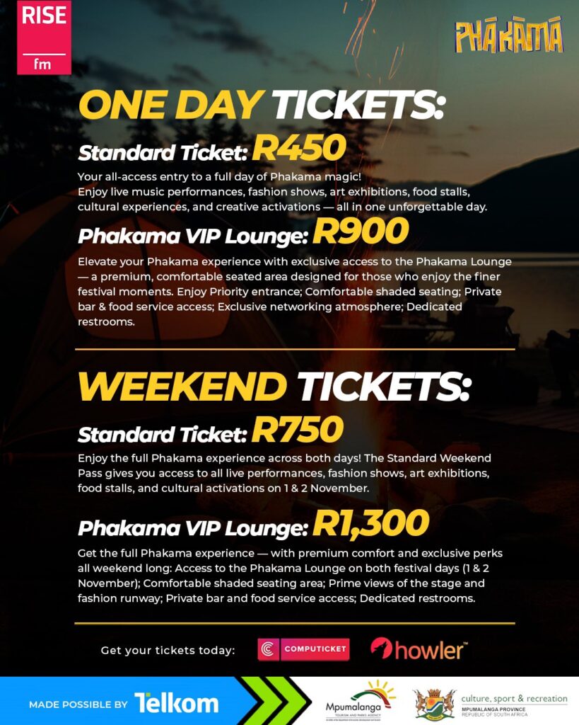 Tickets for the Phakama Music Festival 2025 start from E450 and can be purchased through Howler, Shoprite, Checkers, U Save, and House & Home outlets. Festivalgoers who wish to stay overnight can choose from several camping packages designed to give them a full weekend experience of music and fun. For bookings and more information, the organisers can be contacted at +27 82 715 5810.